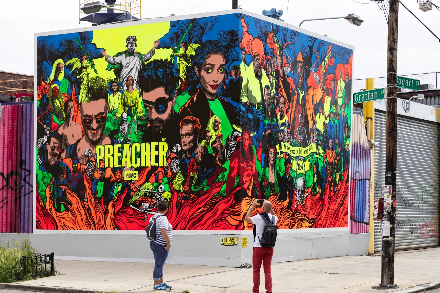 To tease the season 4 premiere of Preacher, AMC wanted to create a mural just as outrageous and twisted as the television series itself. But how does one out-wild a TV show about a chain-smoking, vampire-bestfriend-having, preacher-in-training? Easy: hit up Colossal’s Mad Science department and get weird with it.