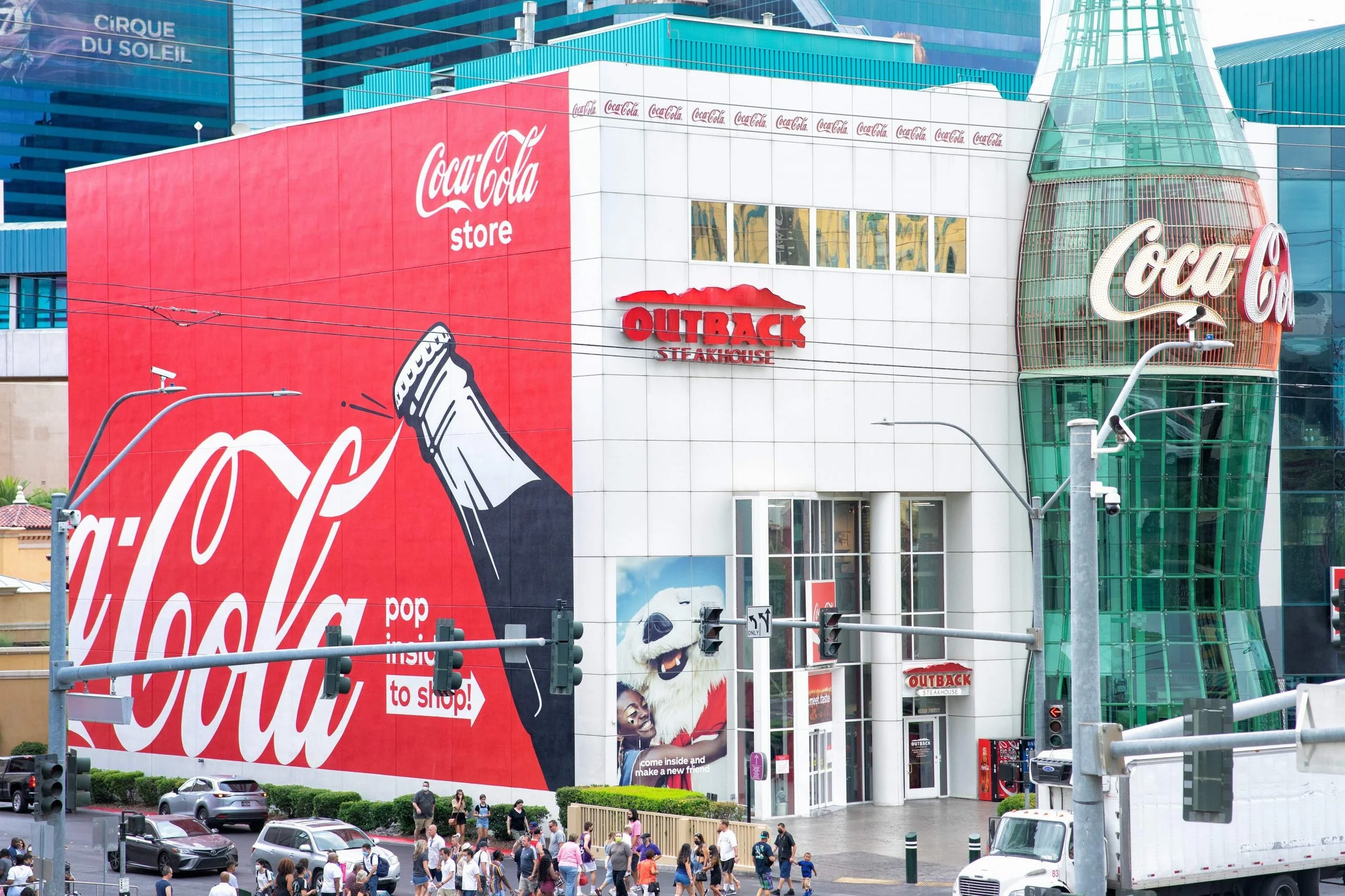 To bring this signature logo, bottle, and cap to the Vegas strip, Coca-Cola® brought in the team at Colossal to execute their bright, bold, and red vision. Coca-Cola® added a pop of color to this Vegas block with its soda pop art.