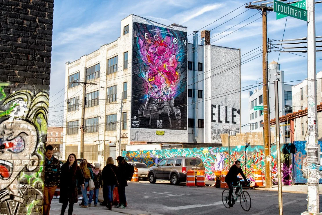 Colossal burst onto the Augmented Reality scene in this collaboration with FX and Blippar. David Flores, a long-time friend of Colossal, reimagined promotional images for Legion, the network’s Marvel show. Colossal brought Flores’ original artwork to life on a busy corner in Bushwick. Blippar then 3D-mapped the hand painted advertisement and built out an application that gave viewers an explosive view into the mind of the show’s main character. The mural was a hit with the app-free crowd, too; its bright colors and Flores’ distinct style earned it a special mention in Bushwick’s popular street art tours.
