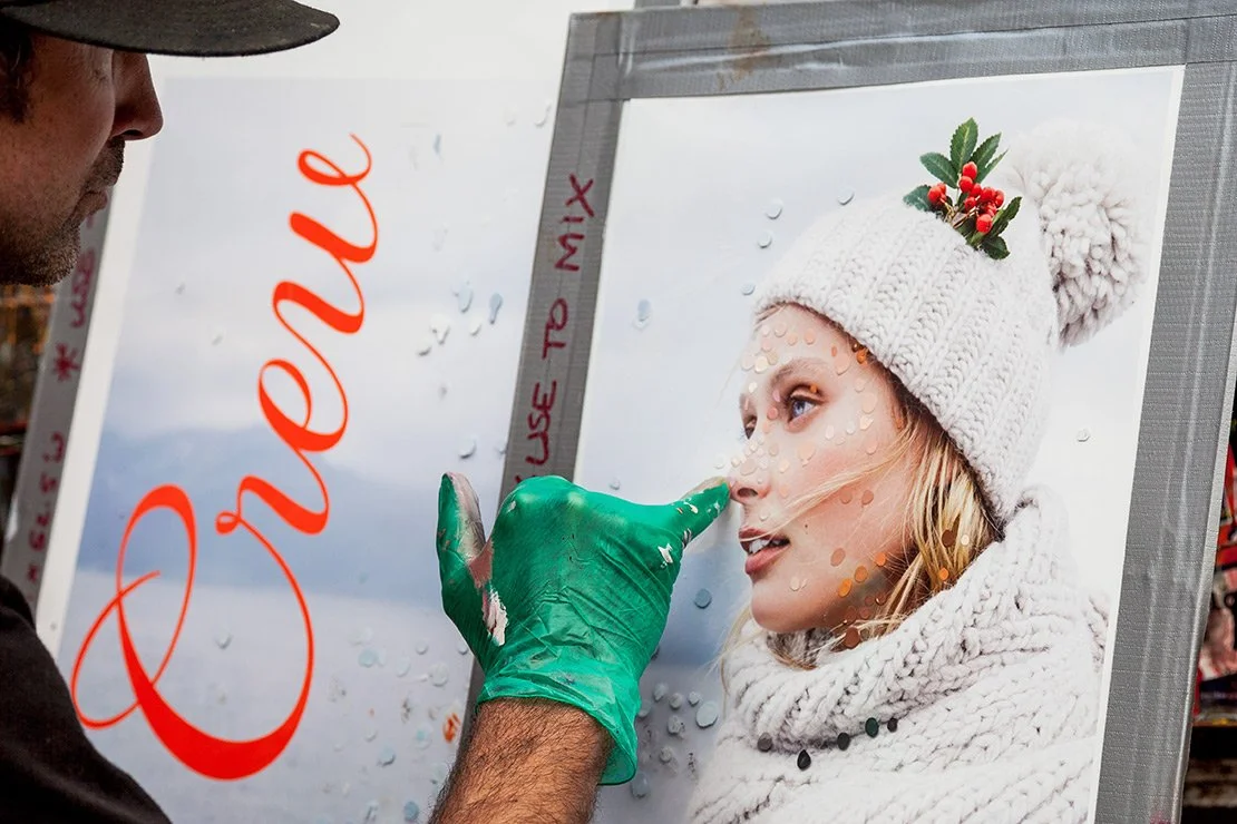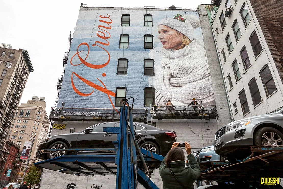 J.Crew and Colossal joined forces to paint two strategically-placed walls in New York City. The primary objective behind the Manhattan campaign was to promote J.Crew’s winter line with a stunning photorealistic mural recreated on our most iconic SoHo wall. In Williamsburg, a graphic mural informed audiences of the upcoming new neighborhood store location.