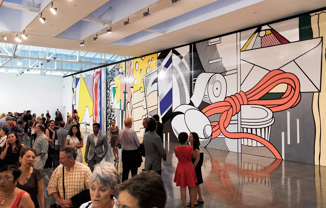 Gagosian opening attendees view Roy Lichtenstein's "Greene Street Mural" hand-painted by Colossal Media. Artwork © Estate of Roy Lichtenstein.