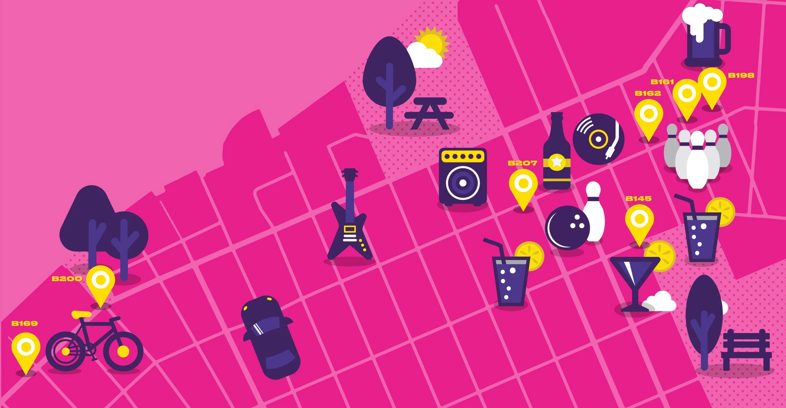 Lyft’s objective was to paint the brand in a fun, bright, and creative light. The brand commissioned Noma Bar, an illustrator and graphic designer, to create the artwork for the campaign. The bold, simple treatments were a perfect match for Lyft’s look.