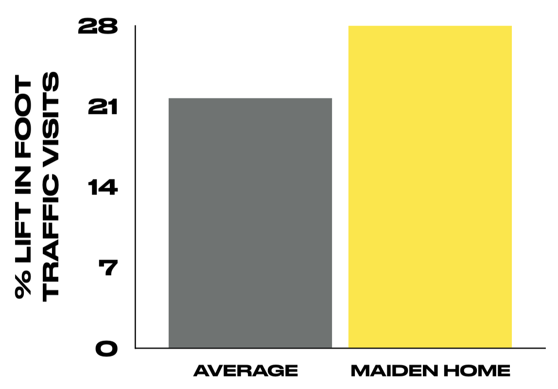 An Accretive study revealed exposure to one of their murals resulted in a 28.19% lift in store foot traffic (+6.49% above the 21.7% Furniture Retail benchmark). After exposure to the mural, consumers visited the Maiden Home store within 5.5 days.