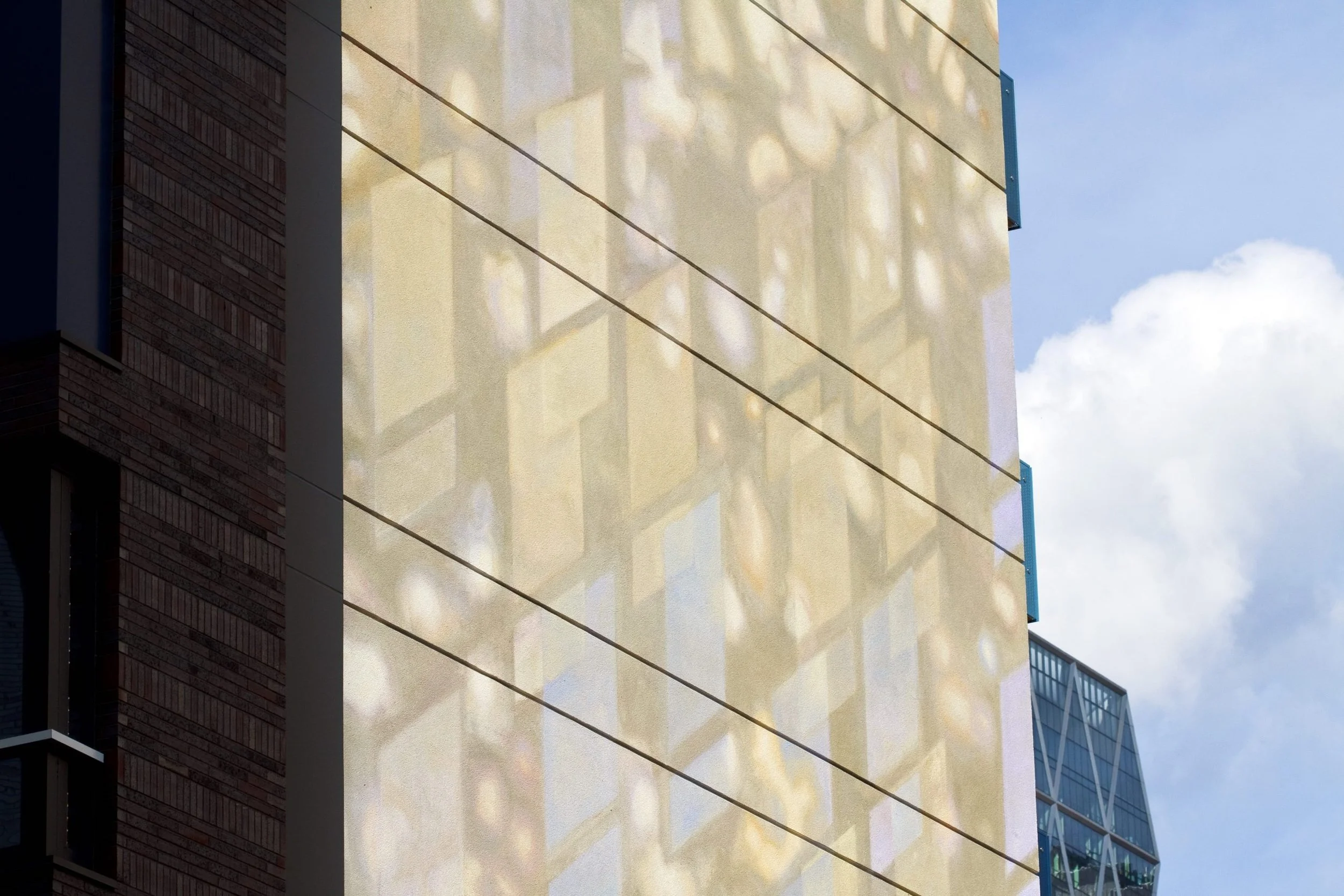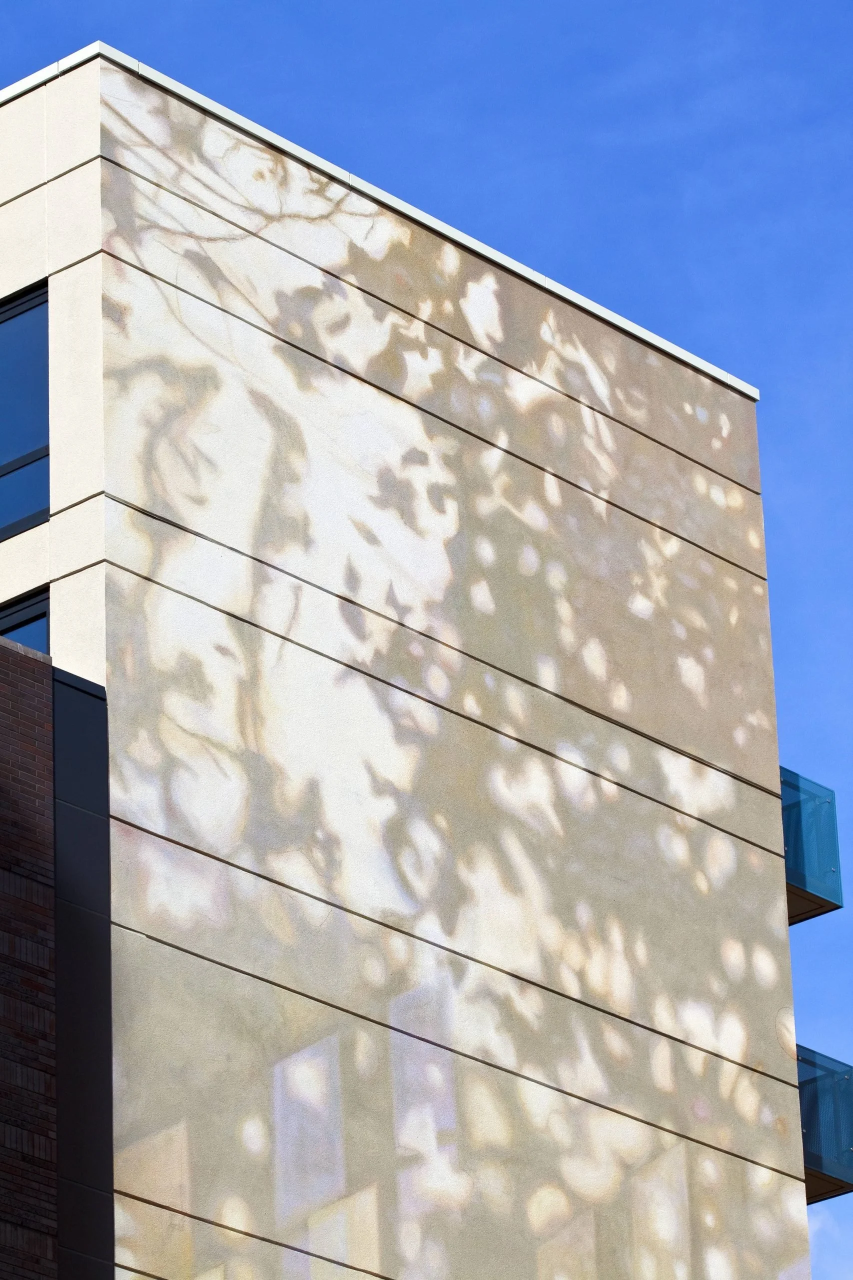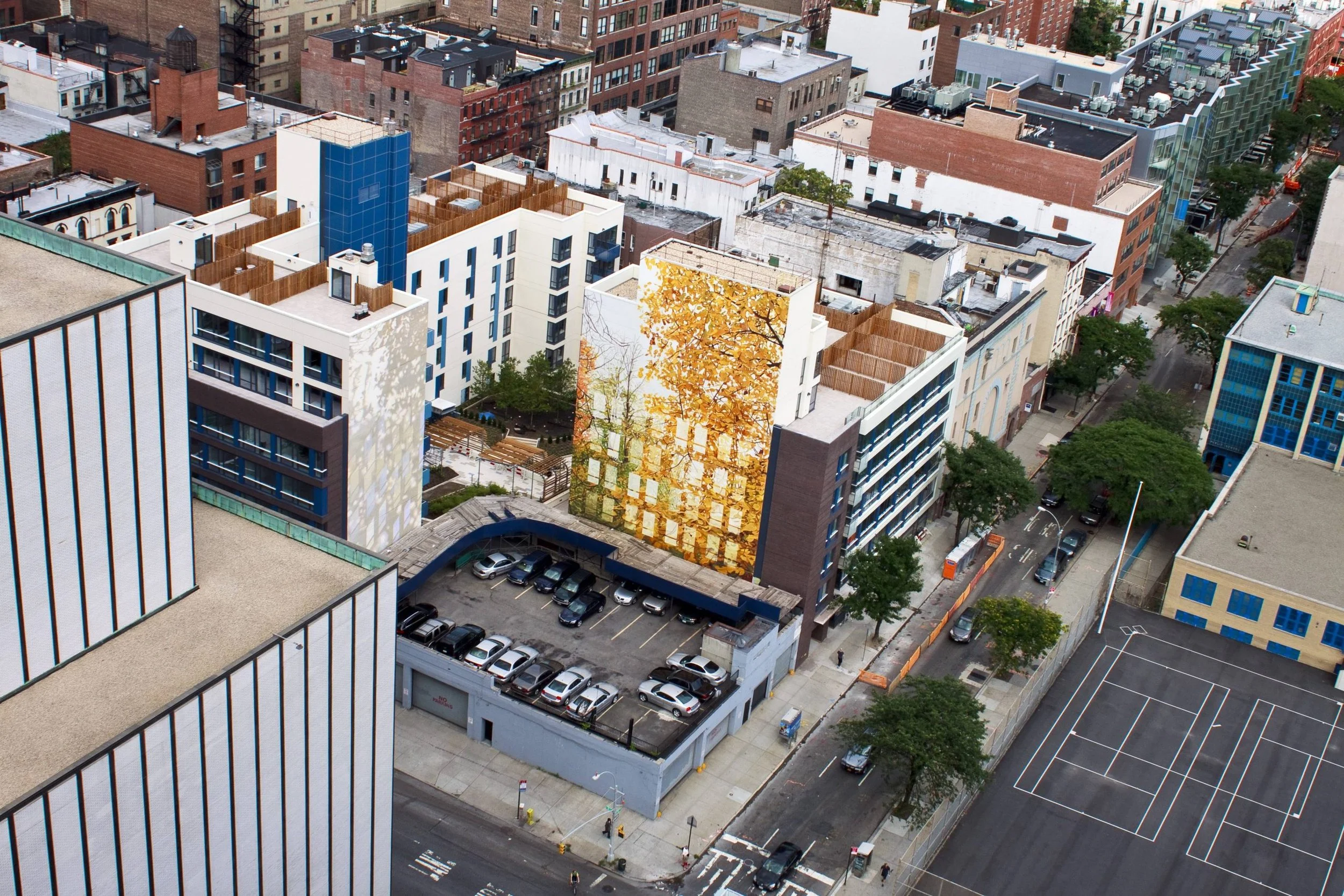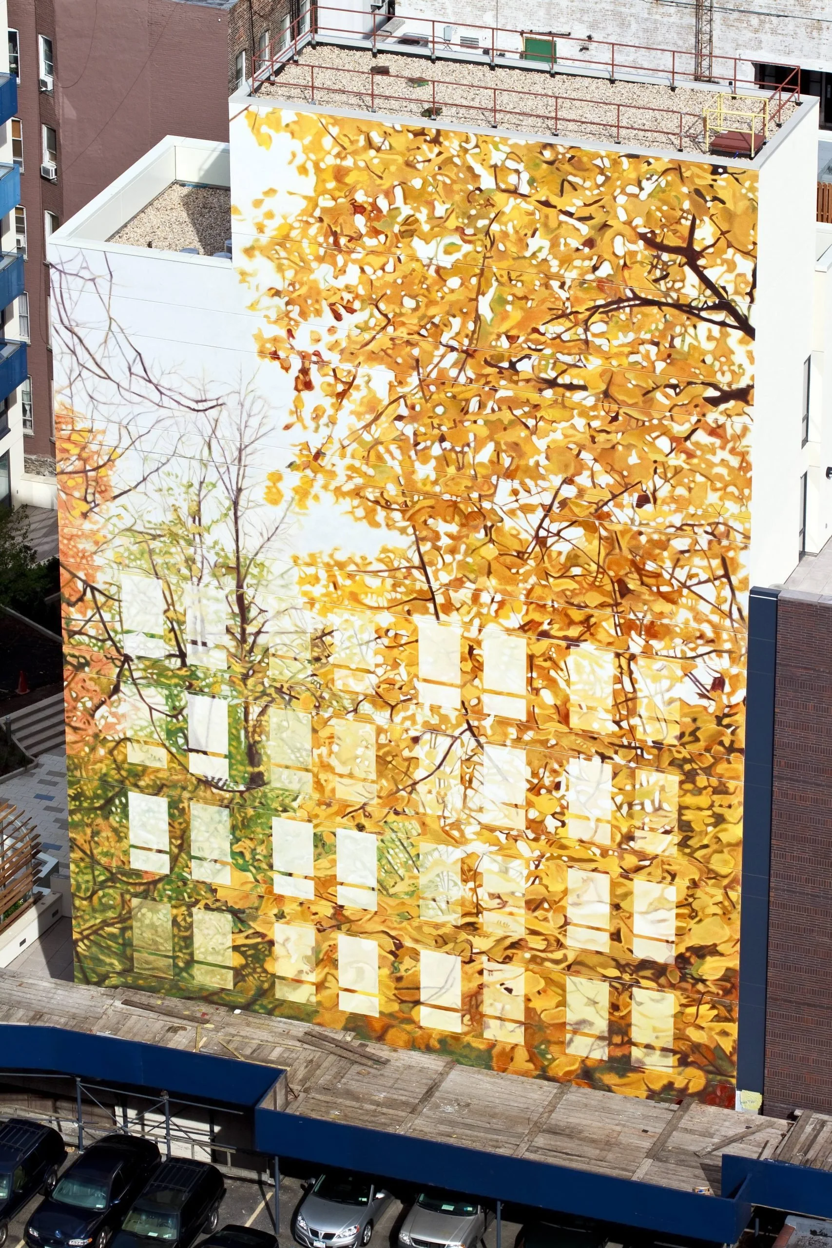 Colossal was commissioned by Alchemy Properties to paint two murals on a residential building at 800 10th Avenue. The original art was painted on canvas by artist Corinne Ullman in response to a competition asking for works that would transform the vertical landscape of the building. Ullman’s winning art comprised two images: one of golden-leafed fall trees and another of their reflections in the shade.