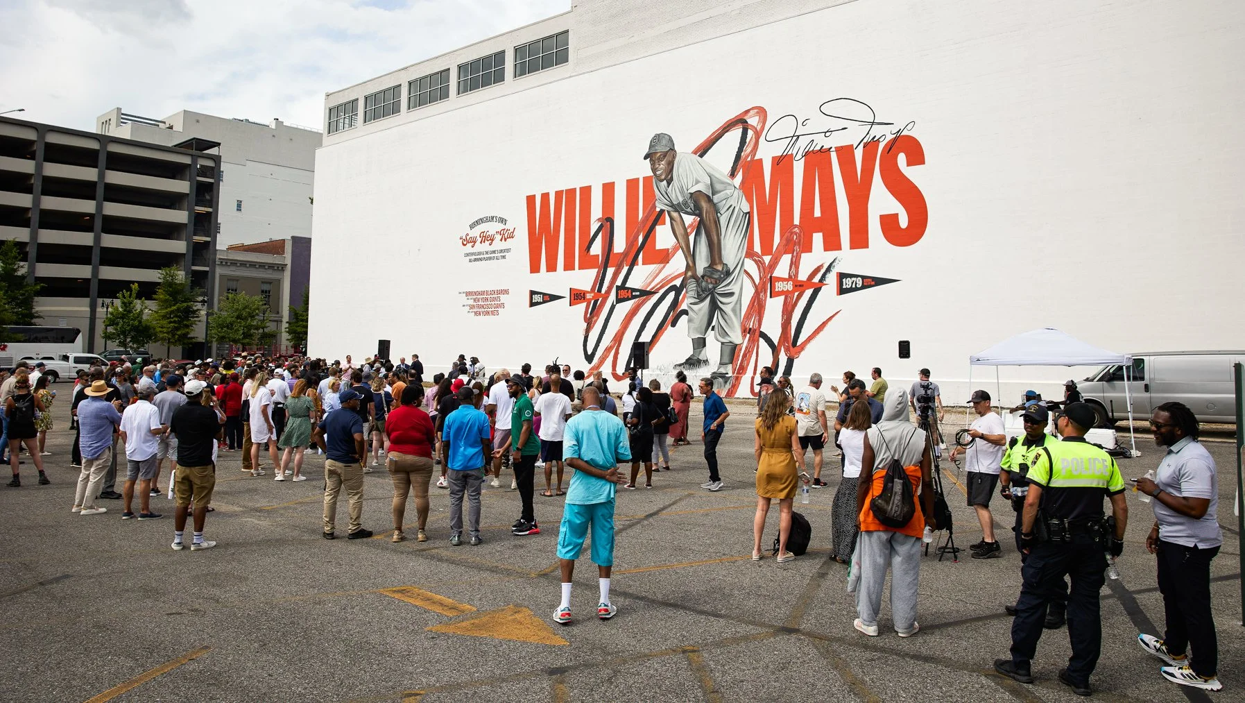 Mays approved the artwork and followed the mural project with the intention of attending the reveal celebration following its completion. Fate, sadly, had other plans. As our painters added finishing touches to his portrait, Mays passed away on June 18, 2024, a day before Juneteenth and the scheduled unveiling event. Interest was evident in the turnout onsite and online, but the homage paid to Mays’ legacy would take the mural out of Birmingham and onto the screens of fans and supporters worldwide: