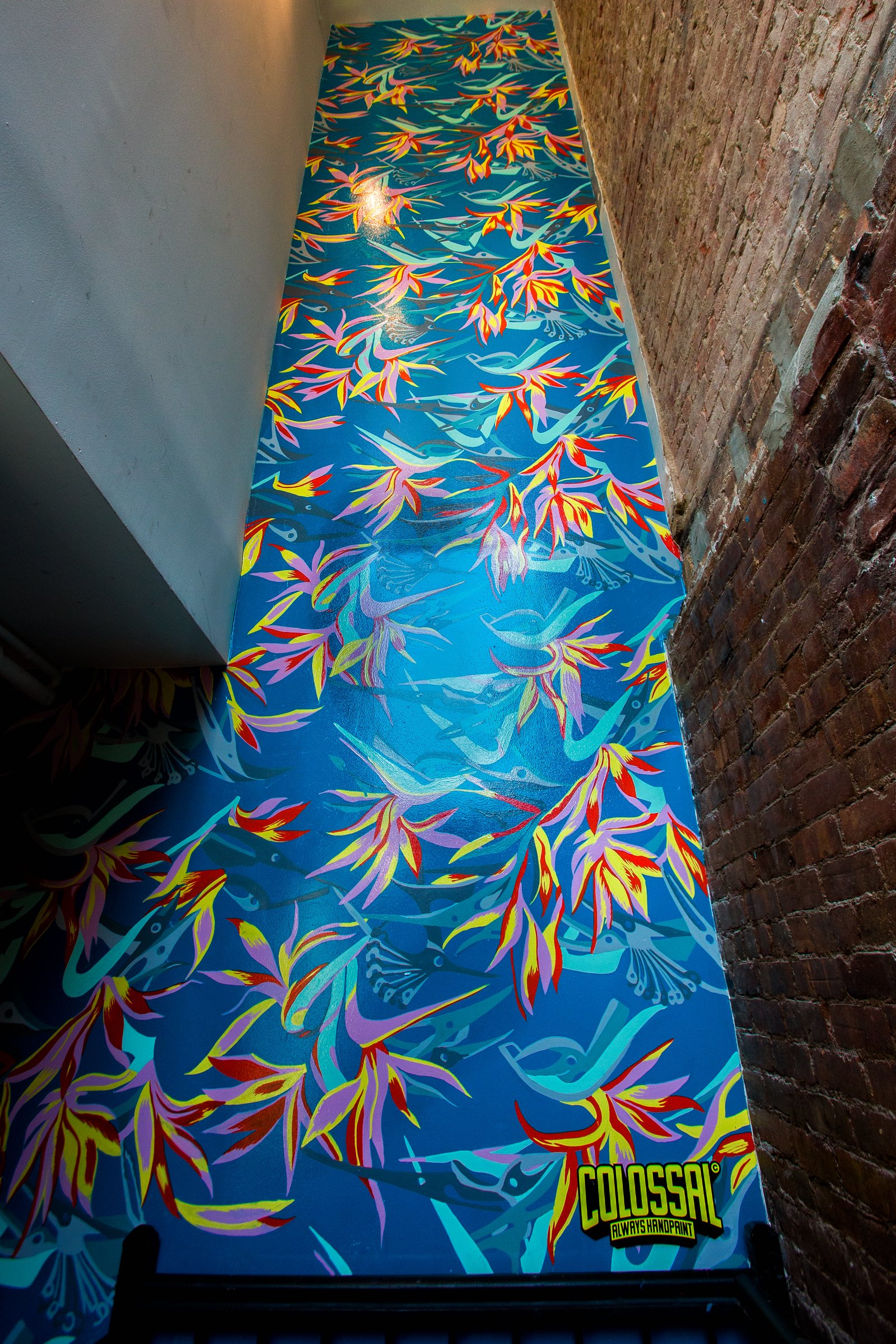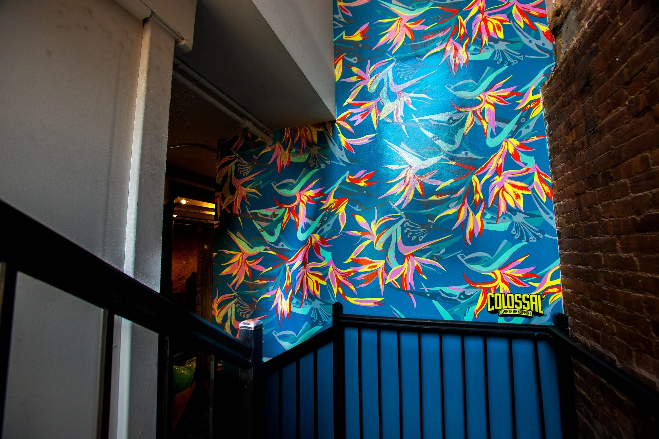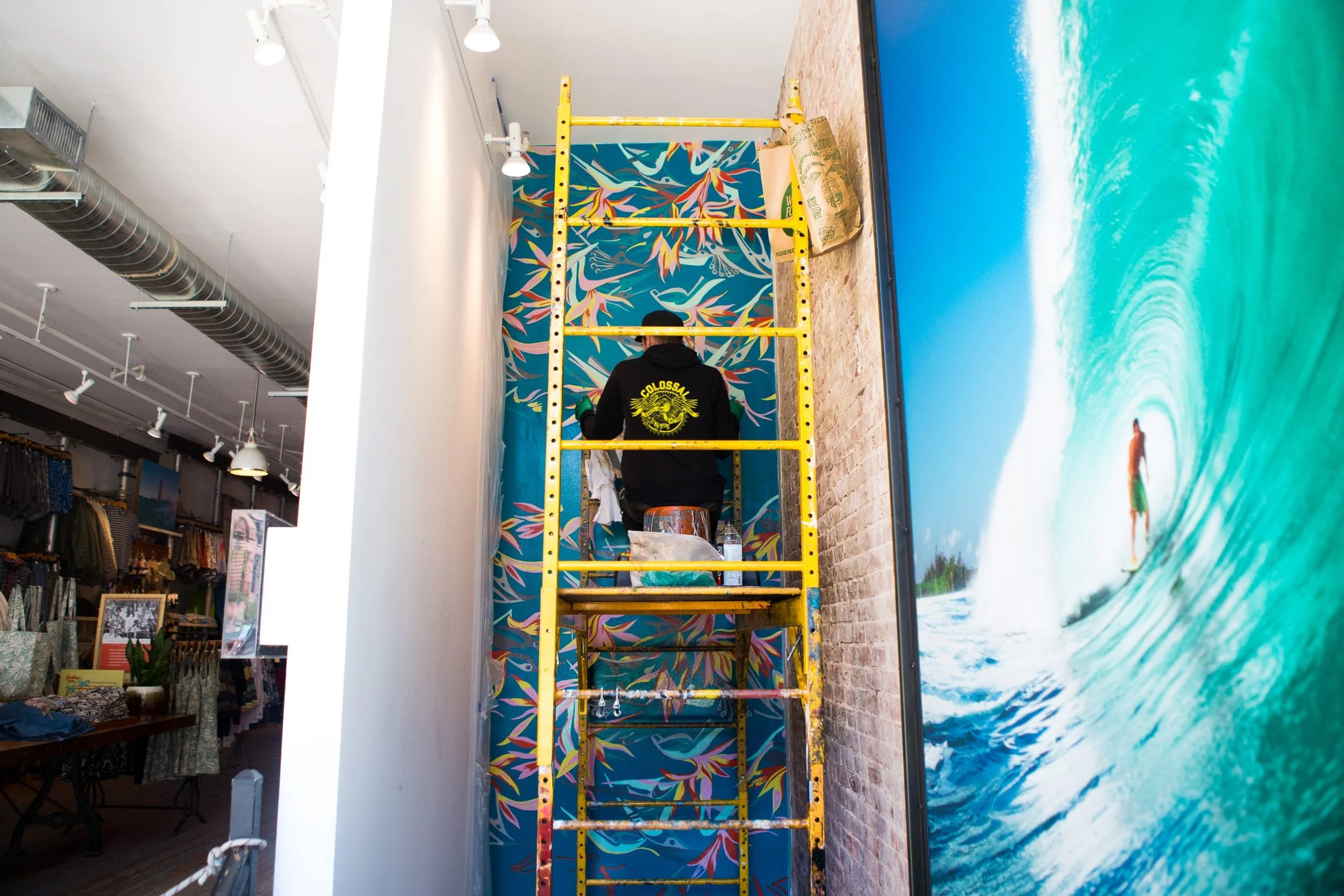 To enhance the shopper experience at its Bowery store, Patagonia reached out to Colossal to paint a birds-of-paradise-themed masterpiece. With the canvas hovering over a steep and narrow staircase, the Colossal team built custom rigging to complete the paint job. In support of Colossal’s contribution, Patagonia placed a Colossal Media plaque on the final display and even turned the vibrant floral artwork into a shirt – a Patagonia legacy reprint!