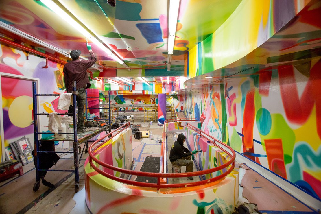 St. Mary’s Hospital for Children, which serves kids and teens living with acute special needs, turned to RxArt for a revamp of its Activity Center. The organization brought on Dan Colen for a site-specific installation. He tossed handfuls of confetti in the air and photographed them, then called on Colossal to carry out his vision. Colossal painted Colen’s work onto every single surface in the Activity Center, transforming the dated space and preserving a moment of celebration for the patients.