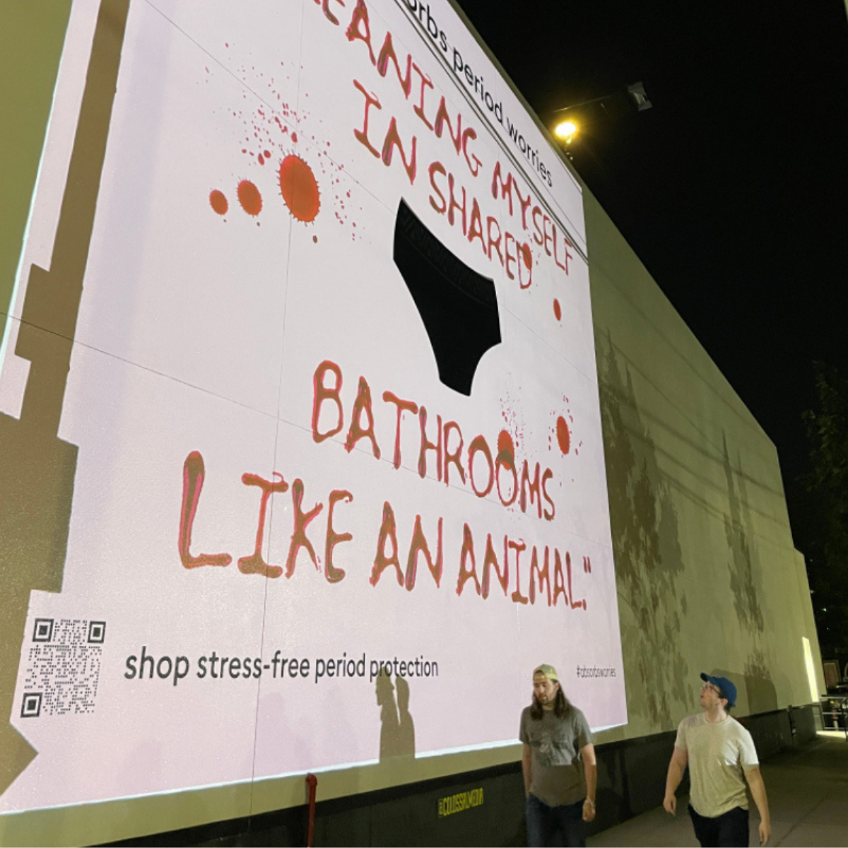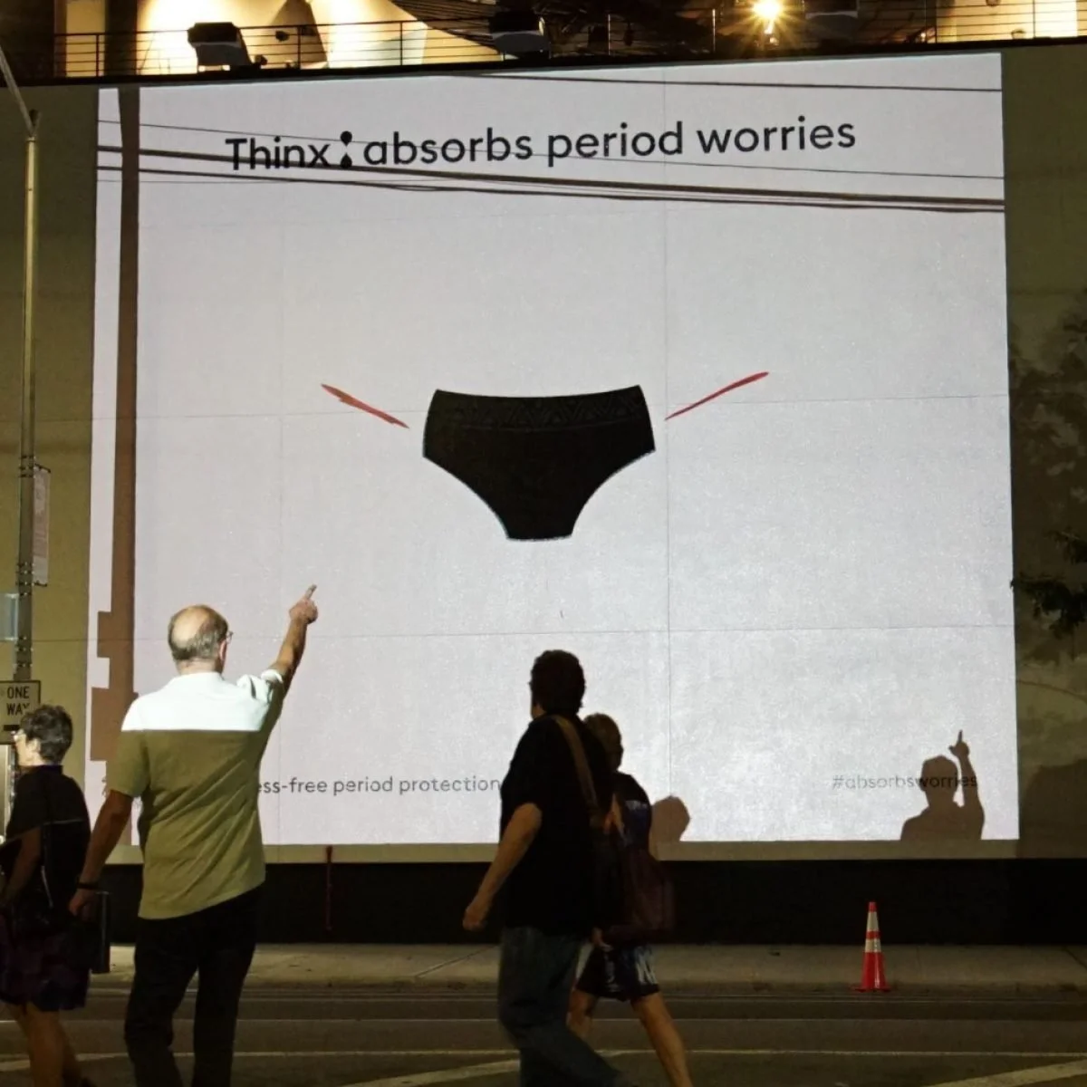 Thinx offers underwear built to “absorb period worries” – and built a campaign to illustrate all the humor and horror those worries contain. The superimposed projection displayed 20 crowd-sourced comments splattered onto the mural’s negative space, then absorbed into a pair of Thinx.
