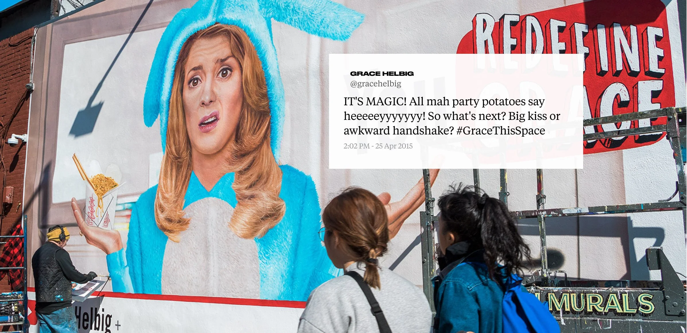 Colossal painted a massive mural of YouTube superstar Grace Helbig, then let her fans control the stage for an entire month. Each week, a vote was cast to decide which quirky pose Grace would assume next.