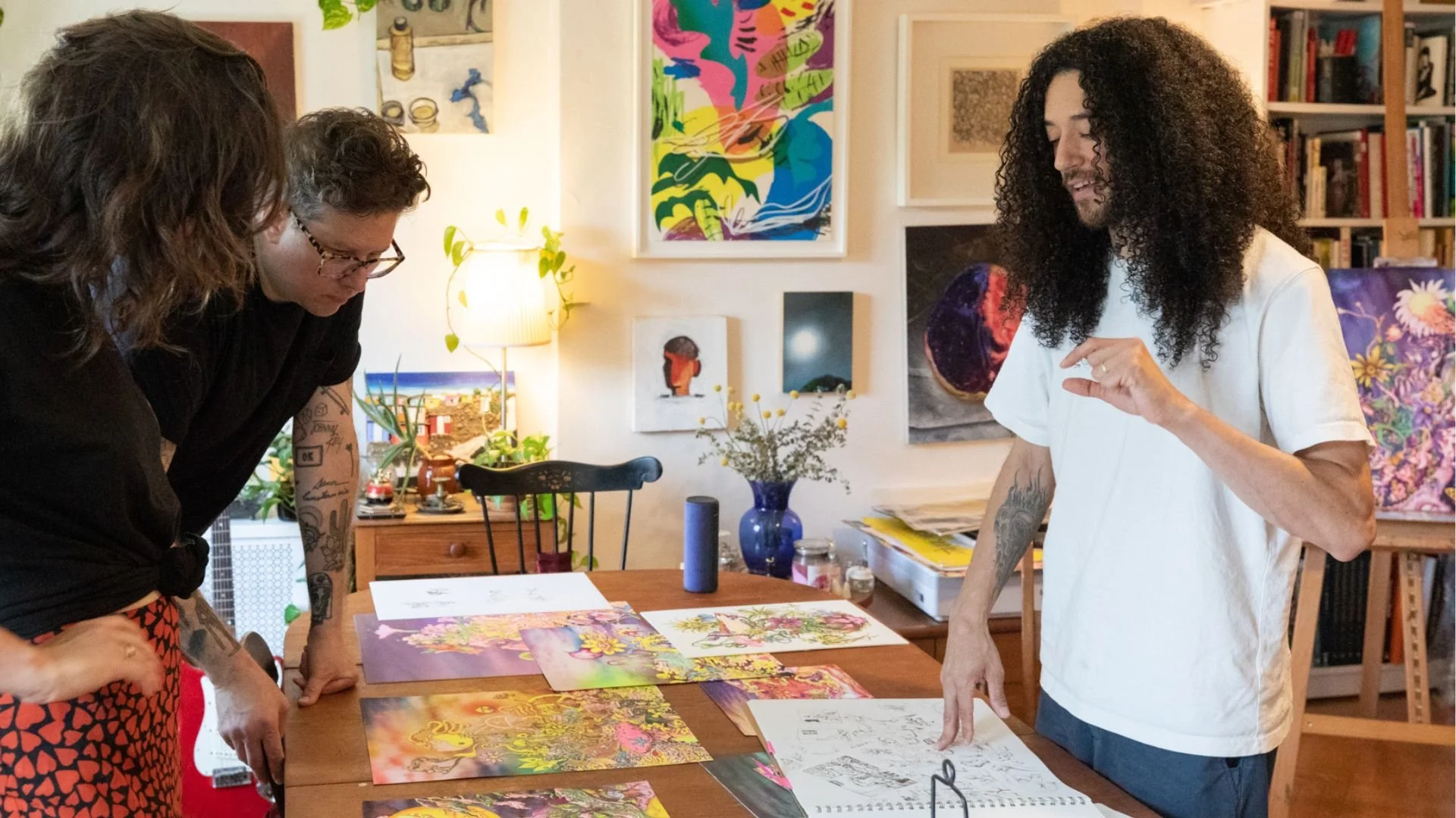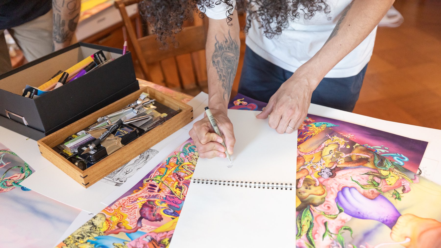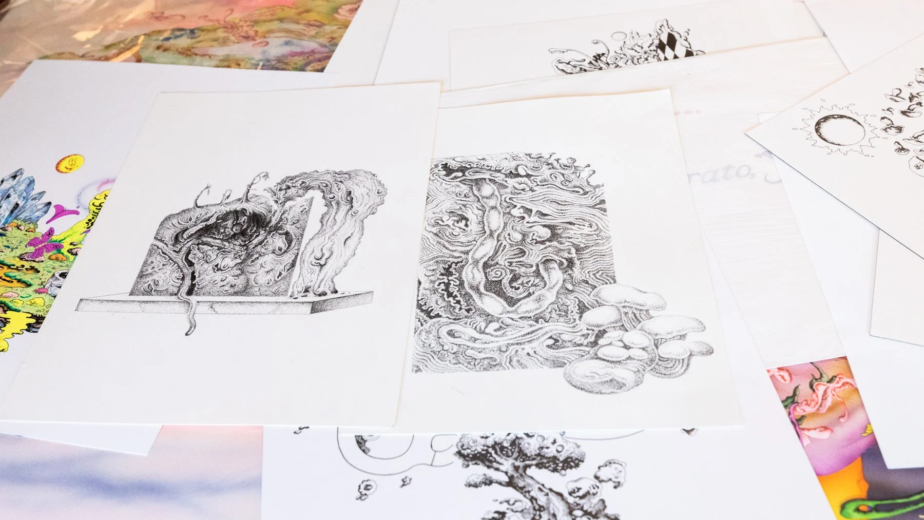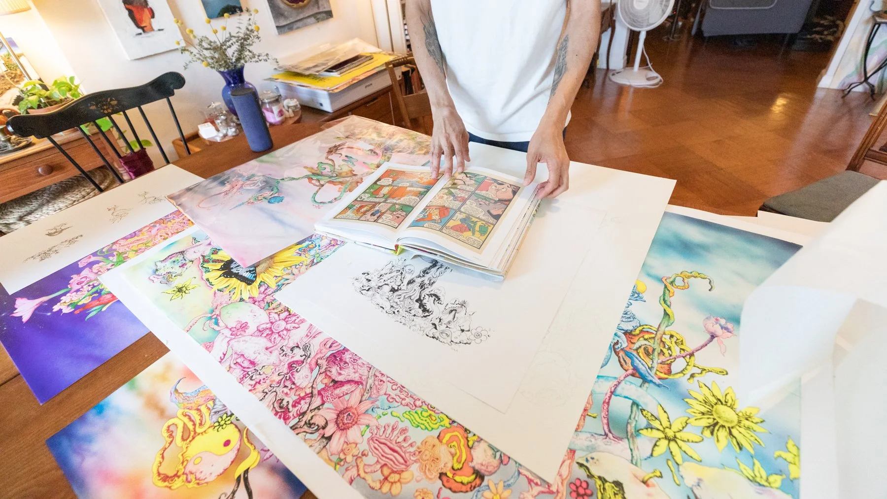 In preparation for our arrival, Herwitt has covered his dining table in artwork of astonishing vibrancy and detail. His work has taken off on social media, but feed posts suddenly feel like a poor substitute for the real magic conjured in this room. His cat, Mrs. Meowz, jumps on the table and strolls across several masterpieces before Herwitt chuckles and gingerly lifts her off. Awestruck, we dive straight in.