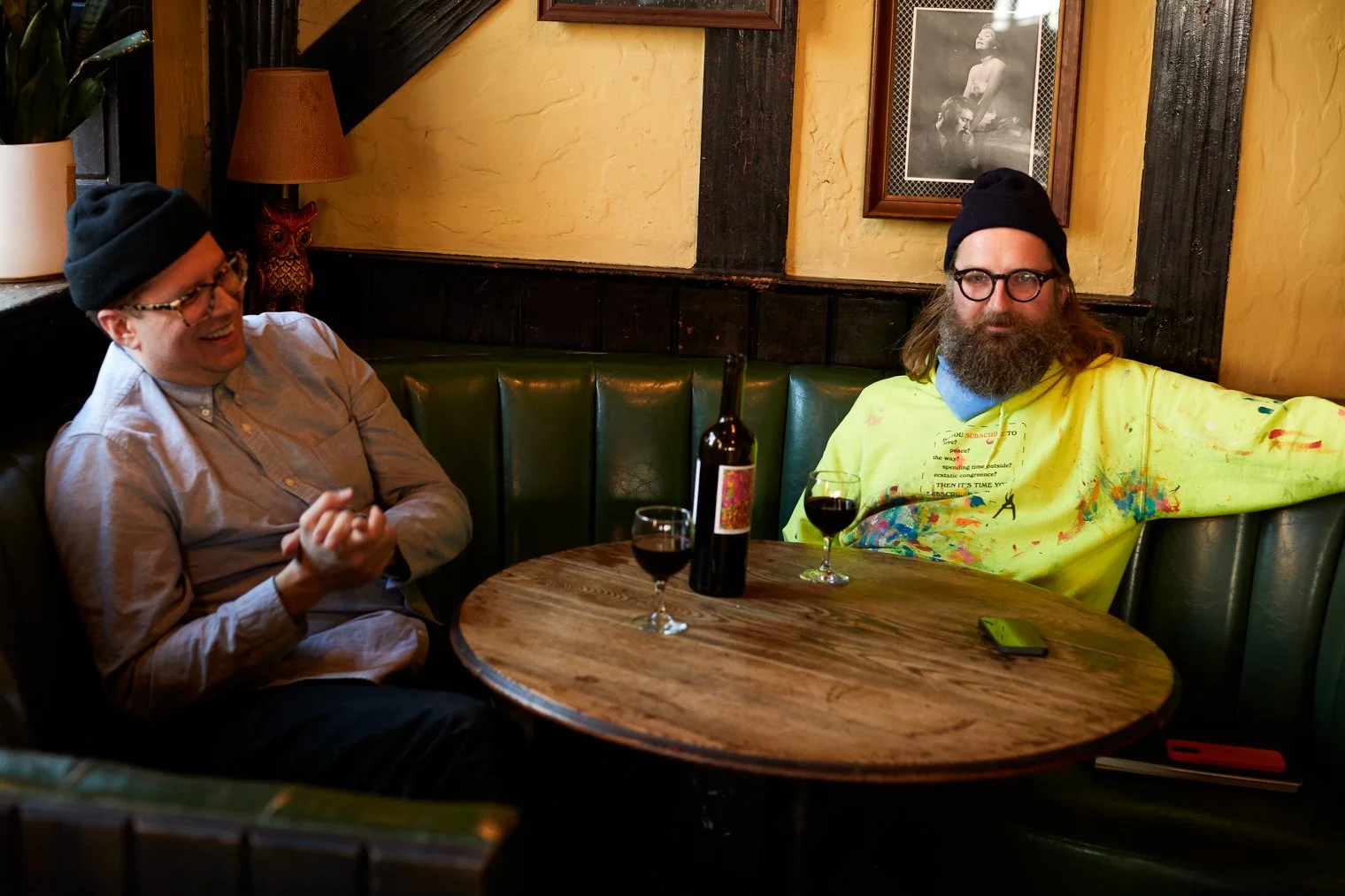 What better way, we thought, to show business partners our appreciation during the 2022 holiday, than to collaborate with a world-renowned artist? Enter the Emmy award winner, Brooklyn legend, and long-time friend of Colossal: Mike Perry. Commissioning a custom wine label design was not only a chance to enjoy some ecstatic art, but also an opportunity for our Creative Director John Samels to connect with his college buddy. After a few weeks' work and a job well done, the two friends made some time to chat and catch up over the fermented fruits of their labor.