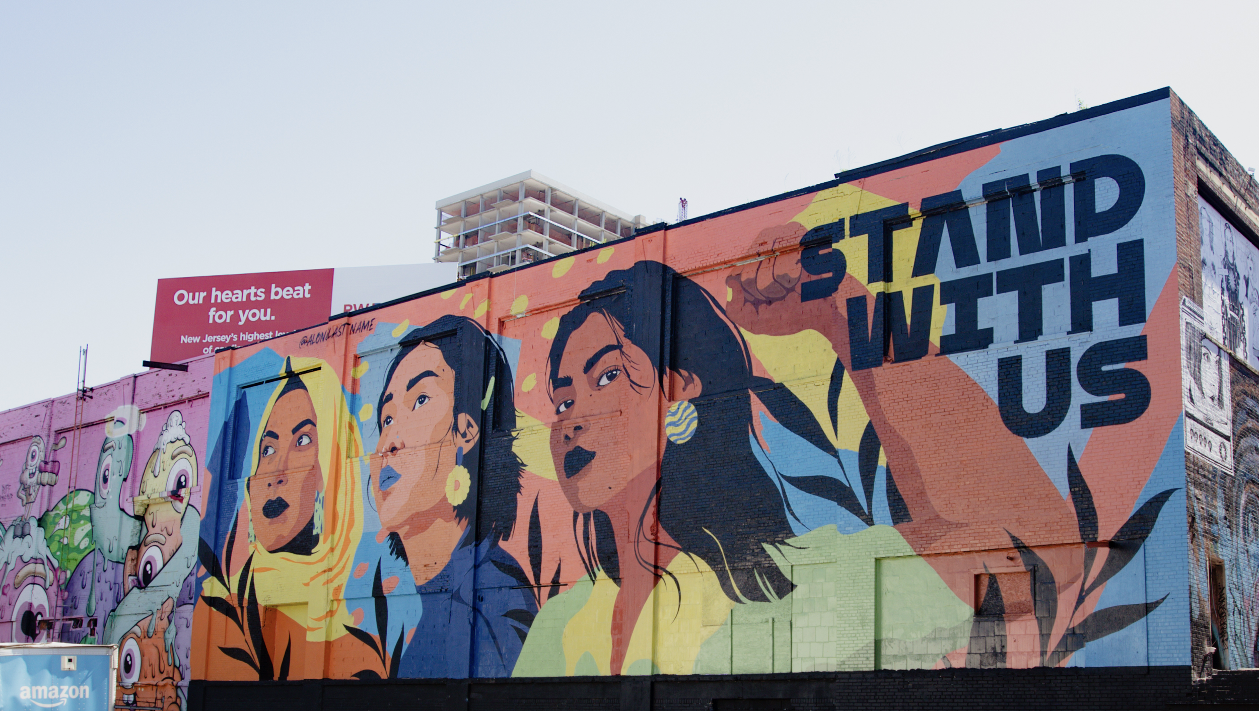 Anchoring the mural mania is a massive piece titled Stand With Us by artist Amanda Phingbodhipakkiya, placed near the Holland Tunnel entrance on Monmouth Street. A recent NYC Artist in residence, her body of work focuses on the promotion of social justice and representation. “Art has the ability to soothe grief, amplify joy, and rally people to action,” Phingbodhipakkiya remarked. “Stand With Us is meant to be a love letter to the Asian American and Pacific Islander community in Jersey City. You are seen, you are heard, and you have allies beside you.”